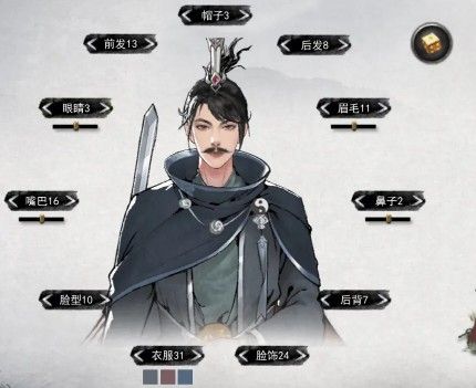 男性仙资硬性要求:前发23,25 眼睛2,3 嘴巴5 脸型1 脸饰18-25(除25外都是胡子)鼻子2 眉毛2 后发1-2 帽子不要5