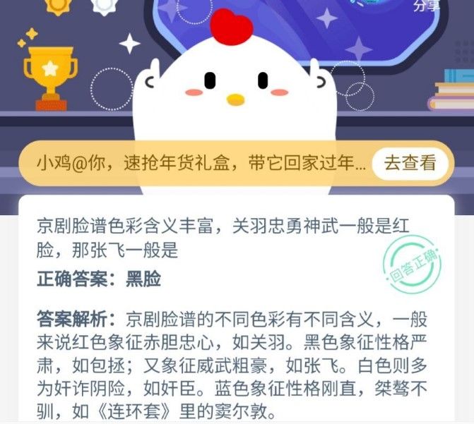 蚂蚁庄园京剧中张飞脸谱是什么颜色?张飞在京剧中也是非常受欢迎的角色,其实京剧中不同角色的脸谱颜色也会有所不同,今天小课堂想要知道的就是张飞在京剧中脸的颜色,正确的选择本站小编这就将答案带给大家。
