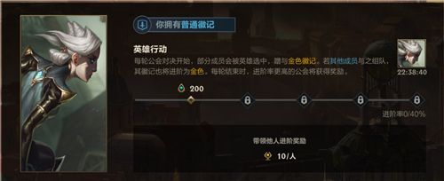 1、金色徽记,在成员普通徽记进阶为金色徽记的时候,金色徽记的成员可以获得相应的功勋奖励,每晋升一个人获得10公会功勋。