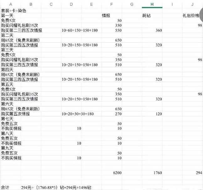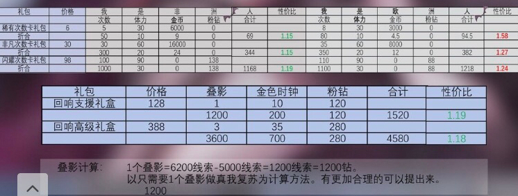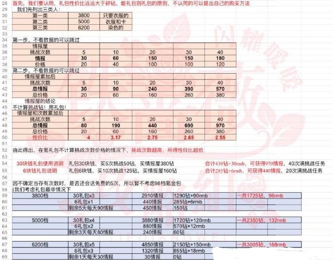 这张表,计算原理在上面,蓝色部分是花钻+礼包的各档位的某个建议。仅供参考