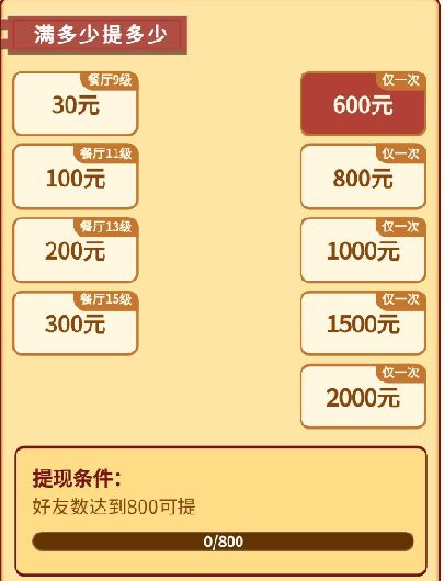 提取30元,餐厅要到达9级,而好友数要到达10。而你达到这些条件后,还有没有其他后续条件,就不得而知了,因为实在没心力测试下去了。