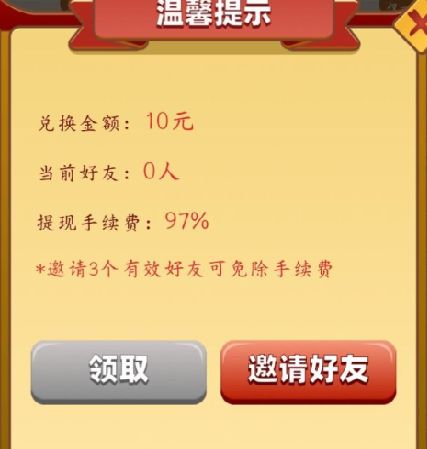 先说餐厅7级提取10元的吧,提取10元需要收取97%的手续费,也就是能提取个0.3元。想免除手续费?可以啊,你得邀请3个人来玩,但我邀请了人,系统给我审核说作弊,不给通过,所以我还是只能提取到0.3元。9级30元提取也是一样的套路。
