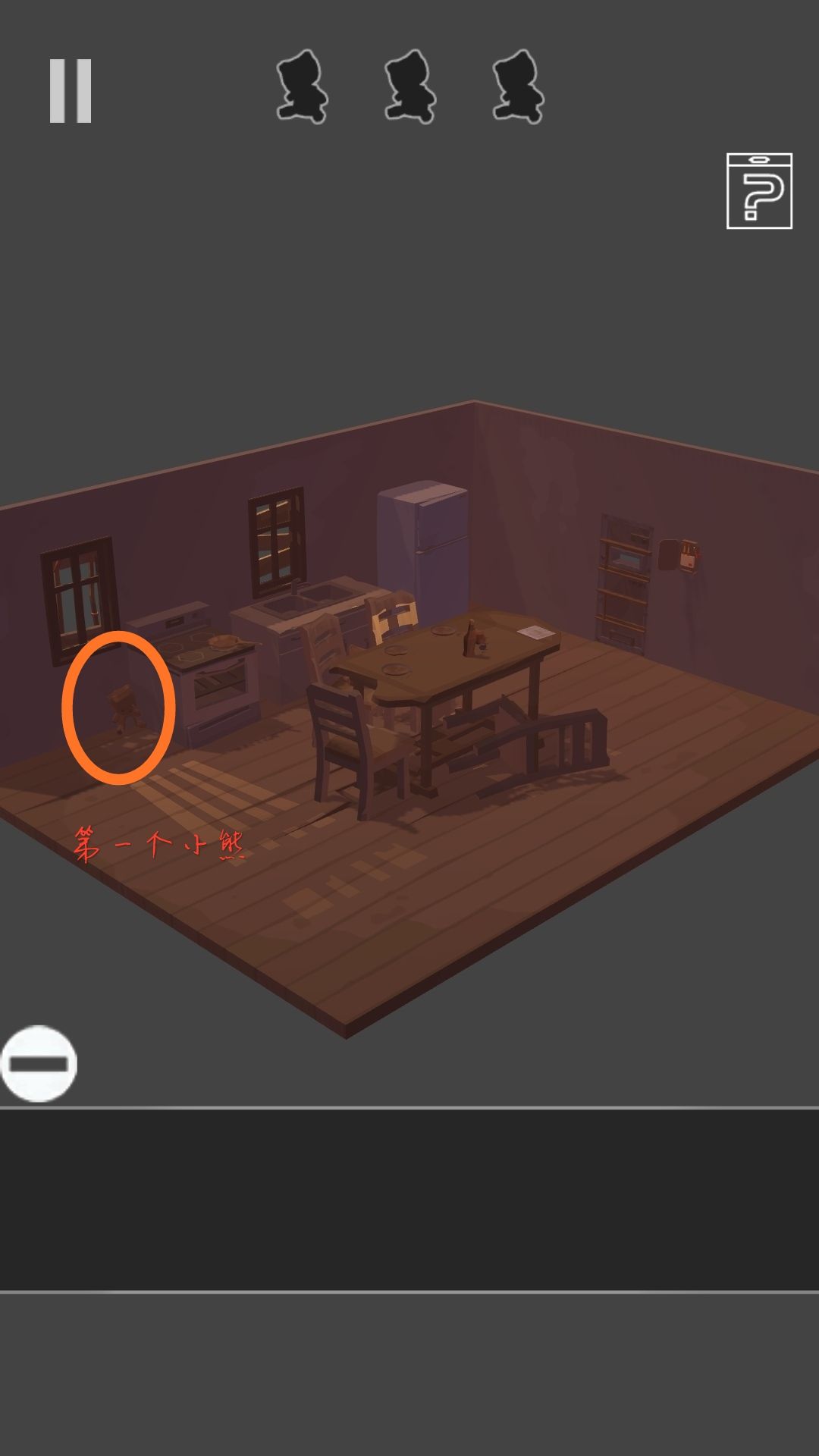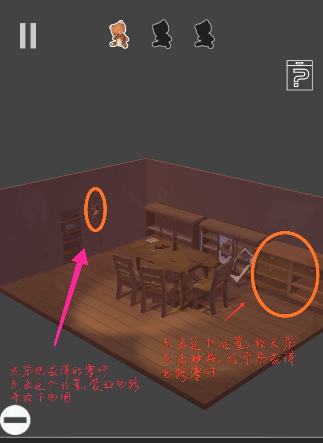 5、弄好电路之后把房间变为原来的样子,之后点冰箱获得一个小木狗,然后点灶台,把小零件放到右上角的槽中,点火把小木狗烧了,获得一把钥匙