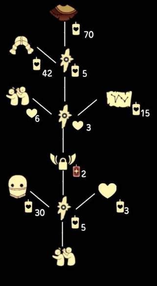 魔法季粗辫先祖的兑换图如下所示,初始节点可以兑换面罩,之后需要花费爱心和升华蜡烛来解锁更多节点,才能够兑换乐谱和2级动作。解锁完所有节点,才能够兑换蜡烛以及粗辫发型。所有物品总共需要175蜡烛、9爱心以及2升华蜡烛,建议玩家们提前准备。