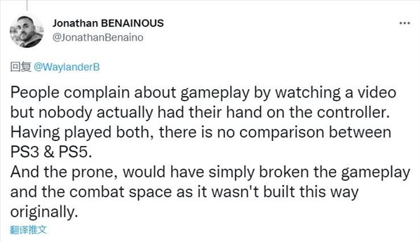 “大家都没上手玩过,仅仅是看了个视频就抱怨游戏玩法。而两者都玩过,就会知道PS3和PS5没有可比性。至于趴地匍匐这样的设计,会直接破坏游戏玩法和战斗空间,因为游戏最初不是这样设计的。”